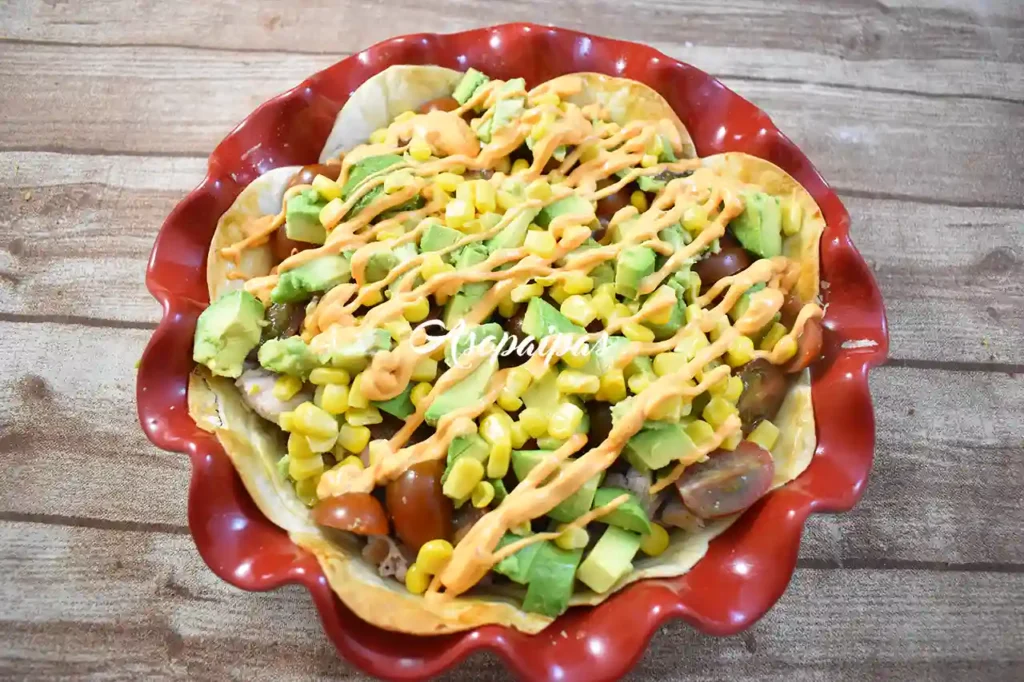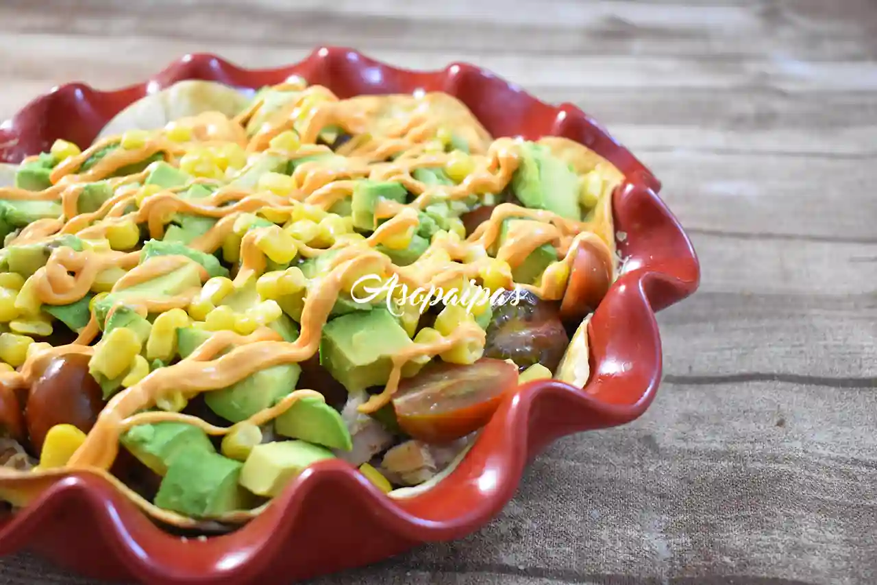 Tartaletas crujientes hechas con obleas al horno, rellenas de una ensalada fresca de pollo, aguacate, maíz y tomates cherry. Se coronan con salsa rosa para un toque cremoso y sabroso.